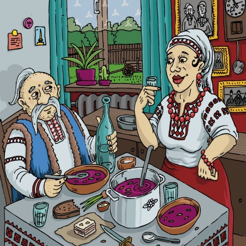 Cabbage, beets, potatoes, carrots, black pepper, garlic, onion, dill, broth, lard, salt.