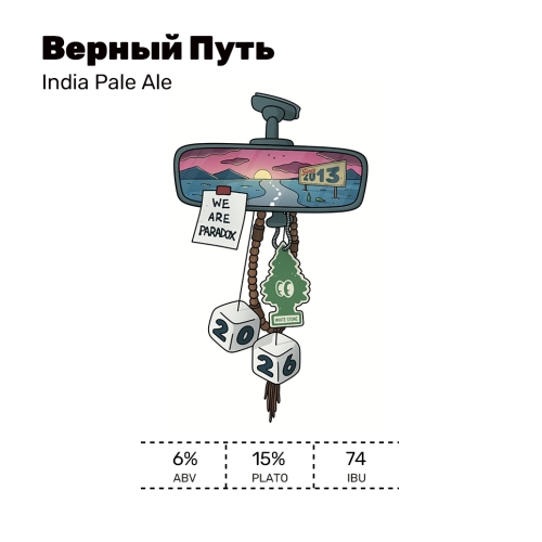 Верный ПутьIndia Pale AleABV: 6%Plato: 15%IBU: 74Hops: Superdelic, McKenzie, HBC 638Стоишь на обочине и видишь, как в твою сторону несётся машина. В ней — команда Paradox, они отмечают свой день рождения! Окна открыты, ветер развевает волосы, слышен смех. За плечами у ребят тысячи километров и 12 лет пути. Водитель смотрит в зеркало заднего вида и видит счастливых коллег, которые тянутся в багажник. Машина тормозит рядом, и тебе протягивают баночку нового IPA. Открой и выпей за их счастливую дорогу и верный путь!